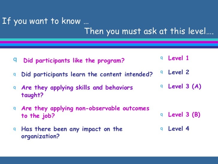 Level 4 evaluation questions. After completing this program, i feel more confident in my ability to deliver a high quality training experience. This diagram is the same format as the one above but with more detail and explanation: The model includes four levels of evaluation, and as such, is sometimes referred to as 'kirkpatrick's levels or the four levels.