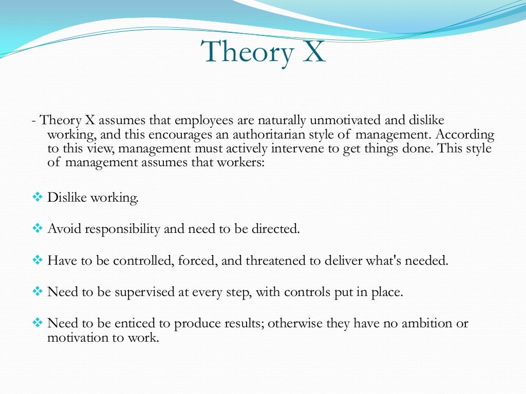 Theory x advanced the view that human beings have an innate dislike for work. According to mcgregor, theory x management assumes the following: This refers to an authoritarian management style, where reward and punishment is seen as the best way to motivate employees to meet objectives.leaders know best, and should closely direct actions taken by staff, with little room for independence and.